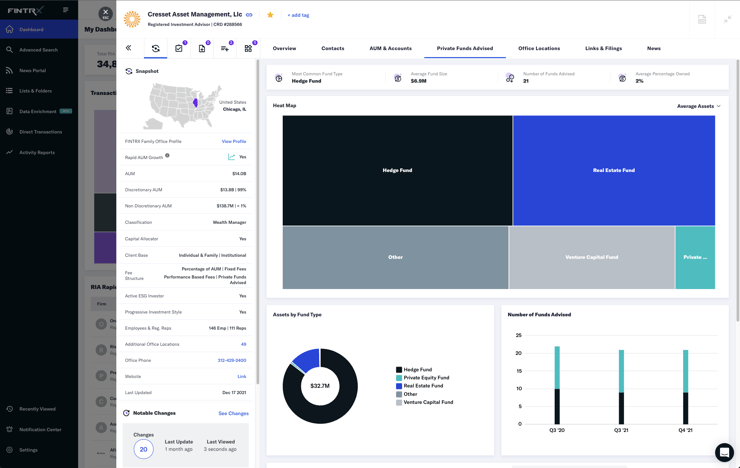 Our RIA Data Module provides detailed breakdowns on advisor assets under management, as well as real-time notifications about rapid portfolio growth signals - delivering you insight into the firms that best meet your needs.